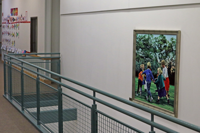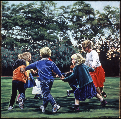 Circle Dance is part of artist Terry Furchgott's body of figurative paintings that explore the theme of connection and relationships among ethnically and culturally diverse people. The composition is based on several photographs taken of friend's children playing, and Furchgott notes that the "symbols of the circle, the clasped hands...evoke a sense of unity which transcends race, sex, or culture."
