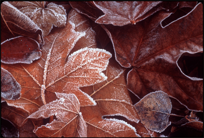 Artist Elwood Jones created the photograph Winter Morning. The composition captures the vivid hues and beautiful structure of frost on fallen leaves. Jones dedicated his photography to presenting the "universal expression" of flowers and plant life as symbols of "peace, sorrow, love, and joy."