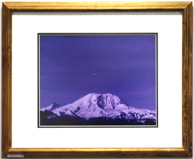 Mt. Rainier Night is a long-exposure photograph by artist Michael Williams. It is part of his series of night-time landscapes that he calls "Stellarscapes" that he began after camping in the Cascade Mountains in 1989. This photo was taken at night using a combination of planned techniques and spontaneity, including holding the camera shutter open for up to four minutes. Commenting on why he does it, Williams notes that "Ever since my childhood home in Tacoma was wiped out by I-5, I guess I've been looking for my place in the universe… it's a good excuse to stay out all night. Mostly, though, I'm still hoping to find my place in the universe."