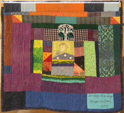 Sandvig Bird Song is a quilt by artist Margaret Liston, who layered patterned commercial and hand-printed fabrics to resembled a musical scale. Featuring a bird image comprised of different scraps of fabric, Liston describes this piece as "a colorful celebration of a bird's music." The title references the Liston's friend, Elizabeth Sandvig, an artist who uses printed sonograms of bird song in her work.