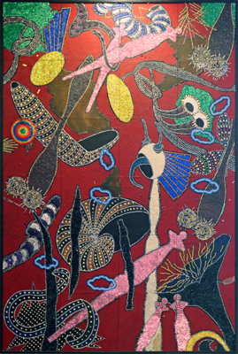 The Sea Beast Still Remembers is an elaborate and vibrant mixed-media artwork by artist Elissa Greisz. It is composed in a multi-layered process using paint and small pieces of iridescent foil on linoleum tiles. Greisz notes that her imagery was inspired by "the plants and animals of sea life, biomorphic life forms, geometric shapes, and science fiction illustrations, etc. I brought those shapes together, arranged and rearranged, added and deleted until the dialogue between the shapes felt right and there was a psychological melodrama that worked on a formal level, too."