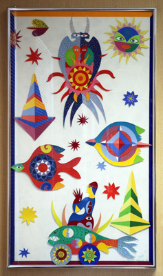 Layla is a mixed-media collage by artist James Pink. It combines painted elements with patterned fabrics. It is part of his body of work featuring images of wolves. The artist and his wife raised three hybrid wolves. They are gray wolf mixed with German shepherd. He notes, "They are shy, non-aggressive animals and only relate to us as pack. The shyest of our hybrids is Layla. She lets very few people ever touch her. She is very pensive and very beautiful. I decided to make a piece of art about her beauty and called it 'Layla.' (She is named after an Eric Clapton love song about unattainable love)."