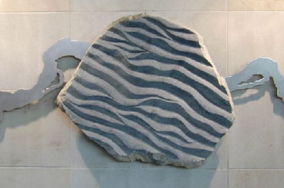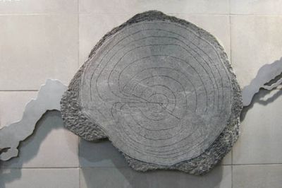 Alluvial Benchmarks by artist Pam Beyette tells the story of the White River plateau in Western Washington. The focus is on its geologic past as well as humanity's imprint on its formation. Cross-sectioned boulders are carved with motifs representing aspects of the region's history and unique landscape. Stone fragments "float" on a river of stainless steel, as a metaphor for knowledge – carving and shaping a future and carrying the past. Alluvial Benchmarks was cut and carved from a single granite boulder.