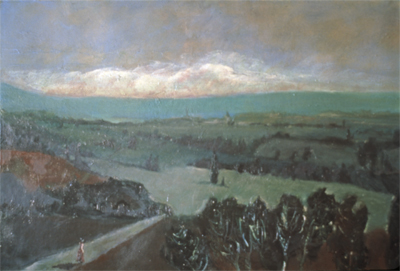 Artist Regina Loch-Elvert’s painting Forest shows the beauty of the Oregon landscape. Her composition references the work of Flemish Renaissance painter Pieter Bruegel during the early 1500s. She describes the Bruegel painting that inspired her as having “a somber and mysterious feeling, which made a deep impression on me. It then was my intention to paint a landscape with this kind of impact in expression and a landscape with a powerful sky.”