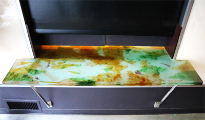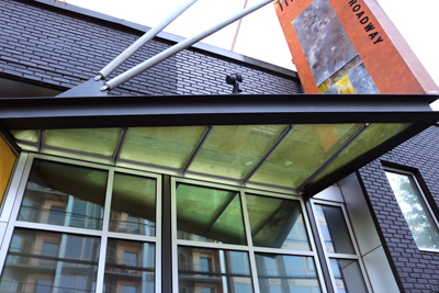 'Erickson Theater Lobby' is a glass and fiber-optic installation by artist Douglas Hansen. It features many components. These include a laminated glass ticket counter and fiber optic floor with inlaid glass pieces. A fused glass canopy of colored glass is installed at the entrance.