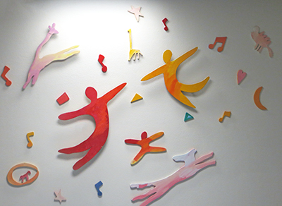 Zuzu's Paradise is part of a series of three wall installations created by artist Dan Snyder for Stanley Elementary. He filled the wall with colorful and joyful painted figures and images. He based some of the images on drawings created by students at Stanley. In this piece, two large figures seem to dance. Musical notes, symbols, and leaping animals surround them.