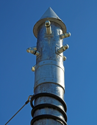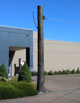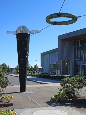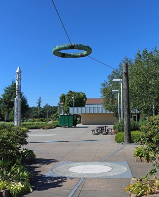 Tug by artist team Lea Anne Lake and Tom Askman is made up of three columns that hold up a larger copper ring in their center. The sculpture symbolizes how everything in life is essentially interconnected. The three columns symbolize the earth, the universe, and humankind. The paving stones underneath the central copper ring are inscribed with the John Muir quote: "When one tugs at a single thing in nature he finds that it is attached to the rest of the world." John Muir was an author and environmental philosopher who is also known as the "Father of the National Parks".
