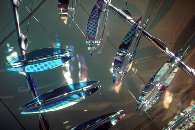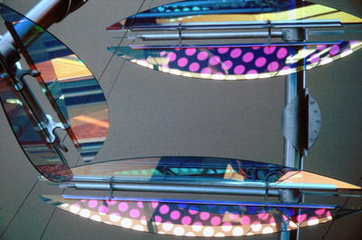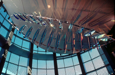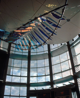 John Rogers used the forms of two bows to support reflective, iridescent glass for his Octaves of Light sculpture. This piece was commissioned for Central Washington University's Jerilyn S. McIntyre Music Building.