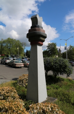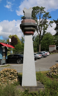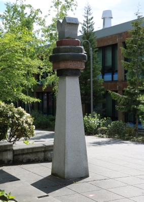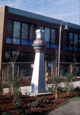 Michihiro Kosuge's two-part artwork Continuation of Linkage draws attention to the connections between Highline College and Central Washington University, which has a satellite campus at Highline College in Des Moines, Western Washington. The two pillars represent stacked books and celebrate teaching, learning, and helping – activities that are the foundations of any college. The sculptures are also like the two colleges: apart but near, connected by a path. They are physically located at opposite ends of the Higher Education Center.