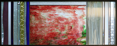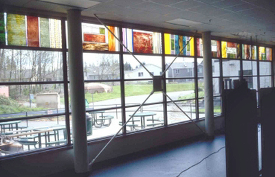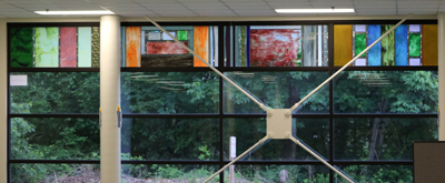 Dick Weiss created this series of twelve stained glass windows using horizontal and vertical panels of colored and clear glass. Weiss notes, "Leaded glass can enhance most structures. It glows day or night. Whether clear or colored, the light is inspiring."