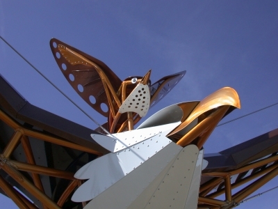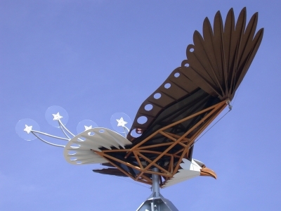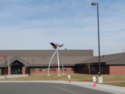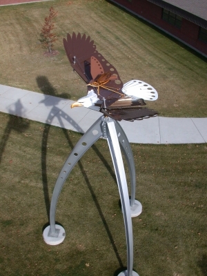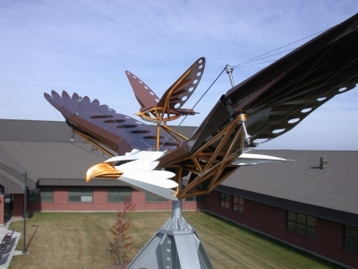 Miles Pepper's artwork was inspired by an Iroquois story of collaboration, where a small thrush soars high on an eagle's back until the eagle can go no further. The thrush journeys higher on its own, eventually hearing beautiful music and bringing it back to earth. At Michael Anderson Elementary, the story is a metaphor for the relationship of students to their teachers.