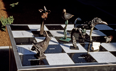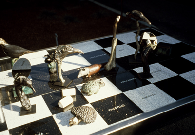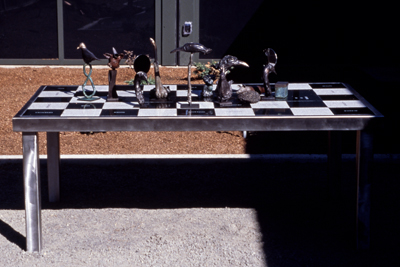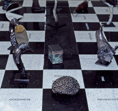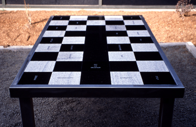 Frank Boyden's Polarities is designed as a game for the staff of the Washington State Patrol's Crime Laboratory in Spokane, Washington. Boyden intends the work to act as both a distraction from the lab's serious work, and as a way of contemplating the nature of good and bad. Boyden provided the game pieces and "board" but lab staff must make up the strategies and rules.