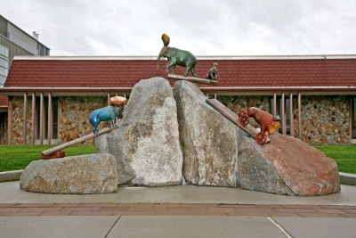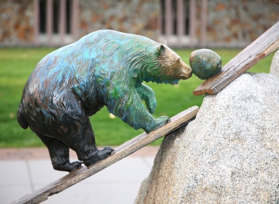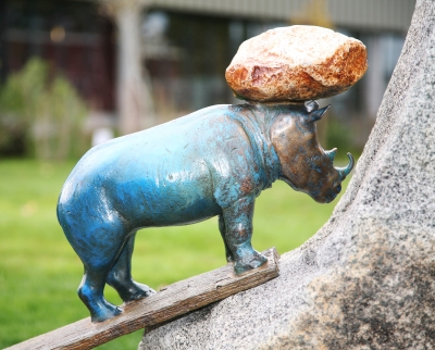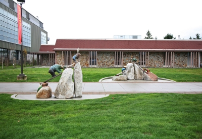 Trailblazing by Brad Rude is a metaphor for the journey of life and education. The two-part bronze sculpture is grouped on either side of a walking path through campus. It shows bronze animals laboring up, lording over, and coasting down carved granite boulders. Along the way, the animals also travel over planks and other obstacles. As students make their way through the Tacoma Community College campus, they might see themselves equally involved with their daily tasks and journeys.