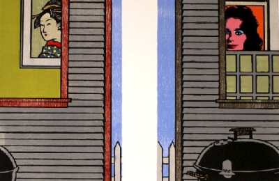 Artist Roger Shimomura created the woodblock print American Neighbors during a print workshop at the University of Nebraska. He uses a divided composition to suggest the dualities of American society. He not only separates the houses, but also presents the duality of interior and exterior space. This artwork asks you to think about what it means to be Japanese American. How do cultural stereotypes influence how we think about our neighbors?