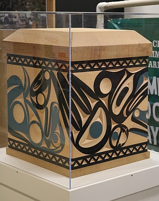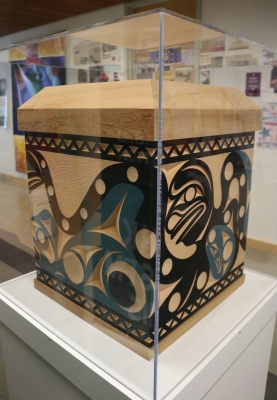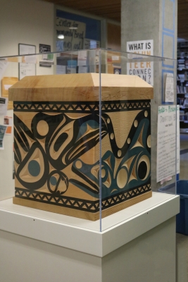 Bentwood boxes are made from a single piece of cedar that is notched at three corners, and steamed and formed into the four-sided box shape. Wooden pegs hold the box together at the fourth corner. They were historically used by Indigenous people of the Northwest to store food, blankets, and other objects, and they continue to be used today. They can also used for cooking: they can be filled with water and hot stones to heat the water.