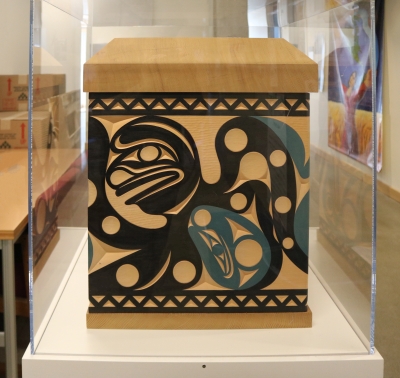 This hand-carved bentwood box Thunderbird Saves Wolf by Andrea Wilbur-Sigo (Squaxin Island and Skokomish) tells a moral story about not letting fish go to waste. Andrea created this box design after she was geoduck diving, and watched how the sea creatures moved and interacted. In this piece you will find Octopus, Salmon, Eel, Thunderbird, and Seawolf.