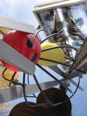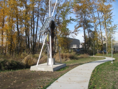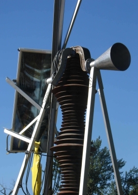 Buster Simpson's Walla Walla Bound - Instrument Implement: Walla Walla Campanile uses tractor disc harrows to create a bell tower. The tractor disc harrows were originally used to work the local soil. The artwork is next to Walla Walla's Titus Creek. Its ringing bells celebrate the health of the watershed and the return of the salmon. The bells also mark the passage of time and how important the creek and its health are to farming: for planting, the seasonal cycles, the daily work, and more.