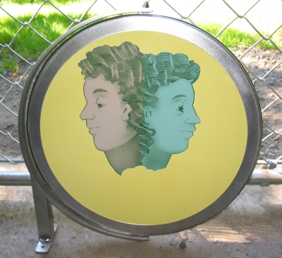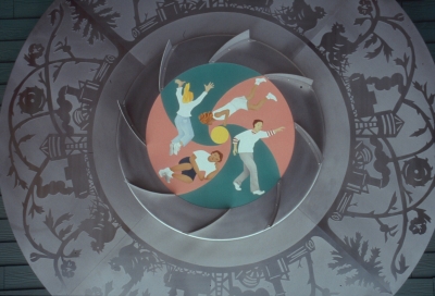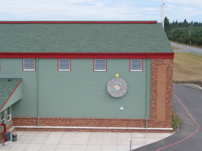 Artist Tina Hoggatt designed the kinetic artwork Turn, Turn, Turn to take advantage of the brisk winds of Winlock, Southwestern Washington. The kinetic artwork also represents the school's active, youthful community. The wall-mounted sculpture has rotating parts. The outer circle represents the community and history of Winlock with etched patterns of pine trees, logging equipment, chickens, water towers, and trains, and vines intertwined throughout. The inner spinning wheel shows four active children. The yellow medallion at the top has flowers on one side and two childrens' heads on other side, and it spins like a weather vane.