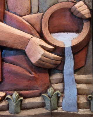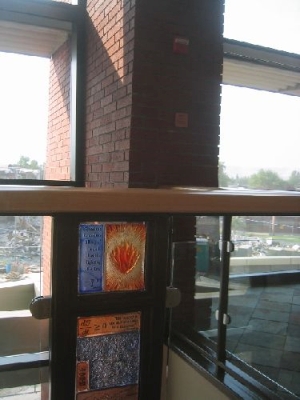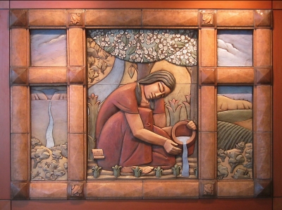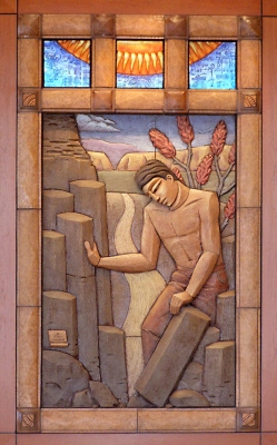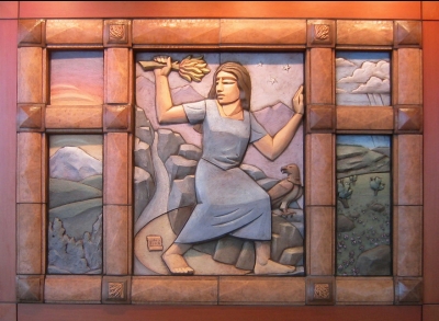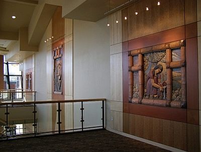 Artist Steve Gardner's terracotta relief sculptures are based on the three allegories of learning: "El Abrecaminos," "The Torch," and "The Garden." "El Abrecaminos" (center) translates to "one who opens the way, one who makes way where there is no way." This idea relates to the many Mexican immigrants who have come to the Yakima Valley to open a way for themselves and their children – but also to all the college students who are paving the way to their future. "The Torch" (left) and "The Garden" (right) are based on myths and metaphors about the importance of knowledge, growth, risk, patience, and self-initiative. All three sculptures feature the Yakima landscape of Central Washington. The artwork includes twenty-four cast glass panels on the nearby exterior windows. They feature formulas, quotes, and images that the artist developed with the Yakima Valley College instructors, related to the various disciplines taught at the college. The glass panels also include patterns from nature in the Yakima Valley such as Ponderosa pine bark and basalt rock textures.