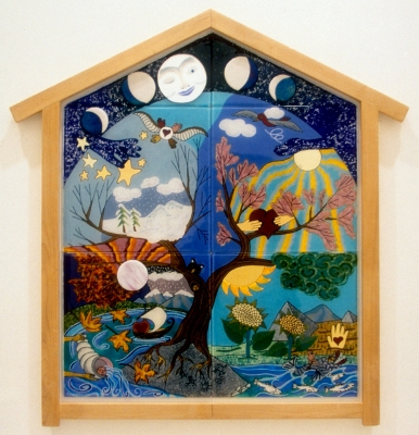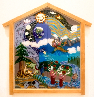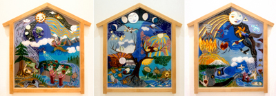 Beginnings, Season Tree, and Elements and Beyond is a triptych of house-shaped, fused glass panels by artist Richard La Londe. The artwork shows the passage of time, growth, and the cycles of life. La Londe also believes that you, the viewer, can interpret the imagery based on your own life experiences. Each panel contains distinct imagery. Beginnings shows the sun at the top center with planets and space ships radiating around it. The earth is just below the sun, and a river is in the bottom right corner. Season Tree shows the moon in different phases across the top. The tree in the center shows the four seasons in its leaves and surroundings. Elements and Beyond represents the four elements of fire, air, water, and earth.
