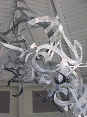 Pending Communication is a representation of the many languages spoken by the diverse student body of Mount Tahoma High School. The hanging artwork is comprised of the letters and symbols of each language. The sculpture's form takes its inspiration from a spiral of rising smoke.