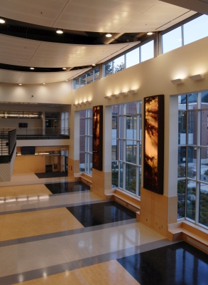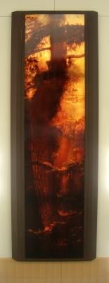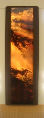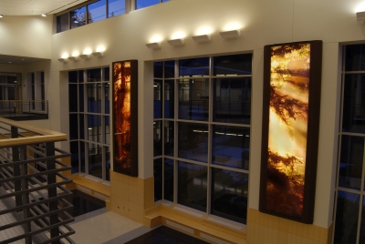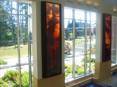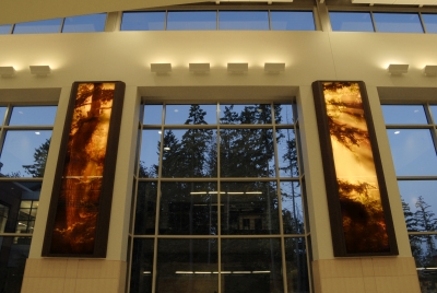 Artist Linda Beaumont's After Image captures and preserves the beauty, atmosphere, and light of the Pacific Northwest forest. The two back-lit glass images also bring the forest indoors to Pierce College in Western Washington, at the same time that the campus continues to grow and lose its surrounding forest.