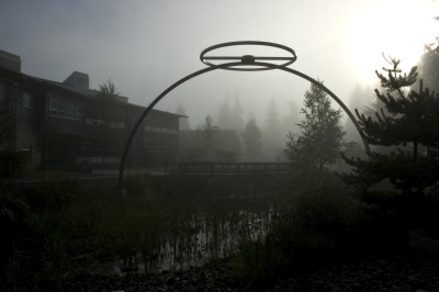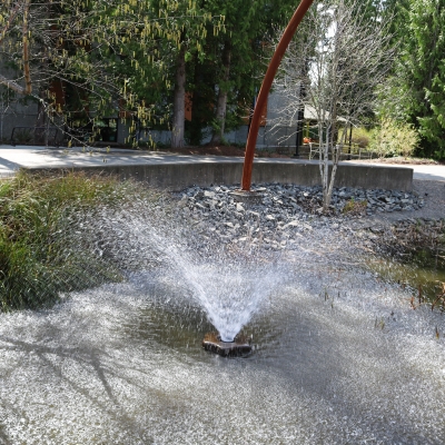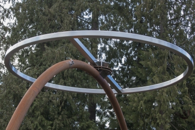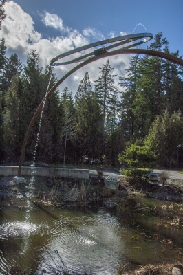 Rain Scale is an interactive kinetic sculpture by artist Gary Bates. It is made up of a 36-foot arch spanning a pond, topped by an 18-foot diameter hollow ring. The ring collects rain water and eventually tips over, cascading a shower of water into the pond below. The artist notes, "Water is the starter of this piece and gravity is the motor."