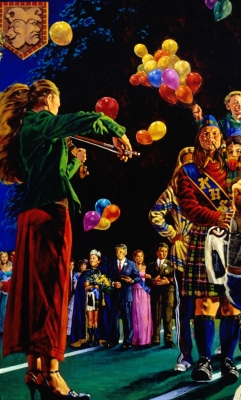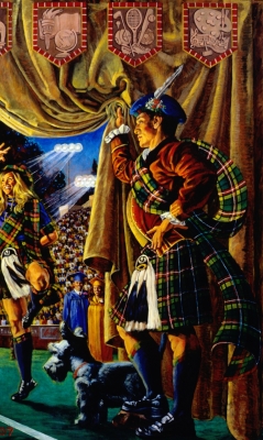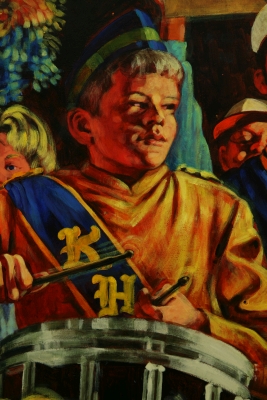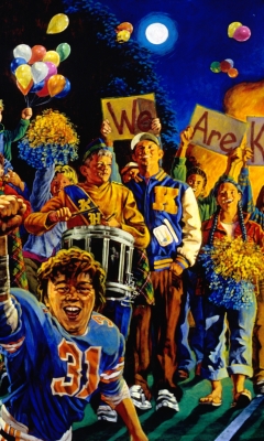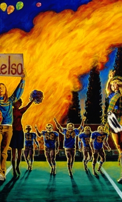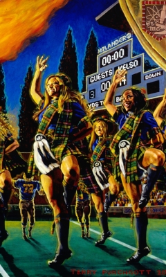 Terry Furchgott's mural painting We Are Kelso reflects the community's pride in its school and school traditions. The artwork depicts halftime activities at a football game, including cheerleaders dancing the Highland Fling and the school's mascot, the Hilander, with his bagpipe and drum.