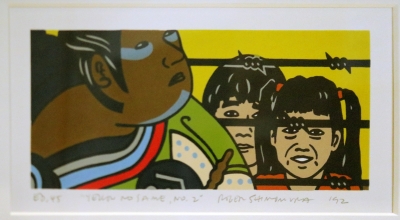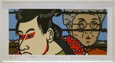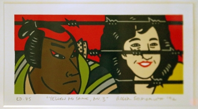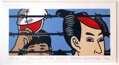 In Yellow No Same artist Roger Shimomura confronts the internment of Japanese Americans during World War II in the 1940s. The artwork explores and comments on America's inability to distinguish between Japanese and Japanese American people. Traditional figures from Japanese woodblock prints and history are in the foreground, while everyday Americans of Japanese descent are shown behind barbed wire in the background. This artwork is part of a collection of artworks located in the University of Washington's Kane Hall. The collection pays tribute to the diversity of UW's campus community and features nine artists whose art explores identity. Student leaders from the UW Minority Think Tank were involved in the selection of the artworks in 2005.