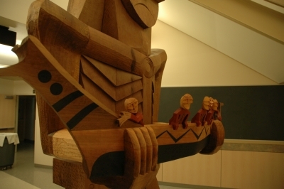 Navigator was created by non-Native artist Adam McIsaac for Columbia Valley Elementary in Vancouver, Southwestern Washington. McIsaac was inspired by the two-hundred-year anniversary of Lewis and Clark's westward expedition from Missouri to the Pacific Ocean in southern Washington State, and back again (1803-1806). He also had a theme of navigation in mind. This sculpture is carved from an 1,100-year-old western redcedar tree.