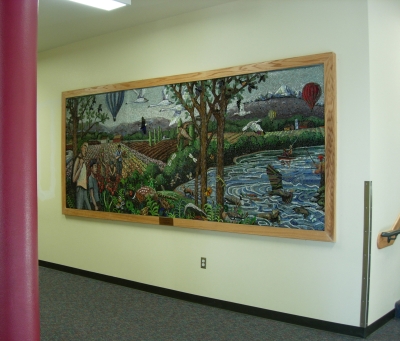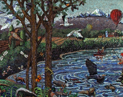 Carl Bryant and Sandra Bryant's mosaic tile mural welcomes students to Lucille Umbarger Elementary with imagery that depicts the Skagit Valley's scenic beauty.