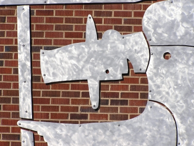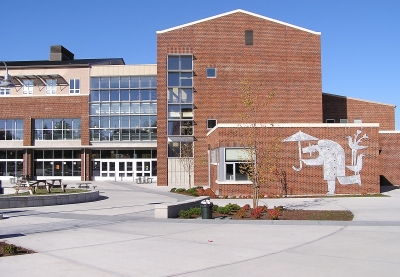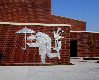 Artist Garth Edwards addresses scale with these large, whimsical figures at Mount Vernon High School. The Umbrella Man and Bird frame the entryway as students pass by.