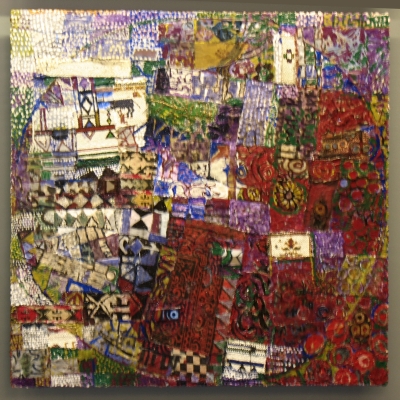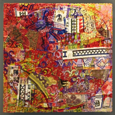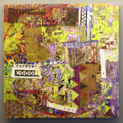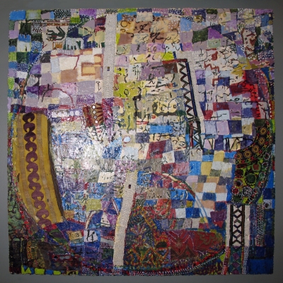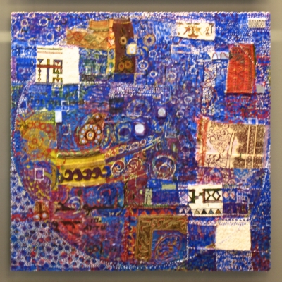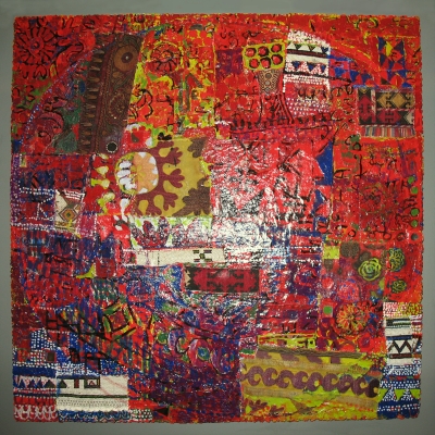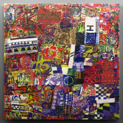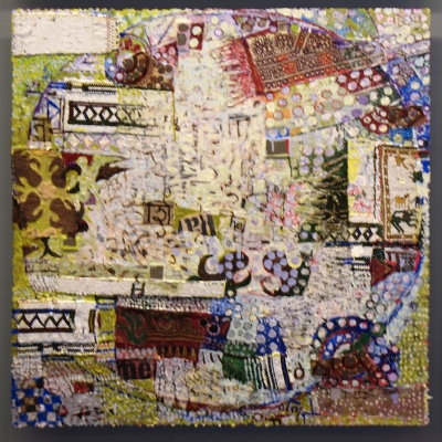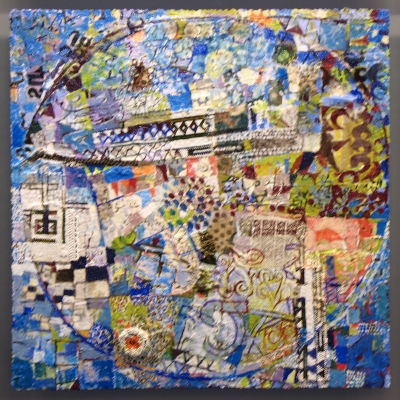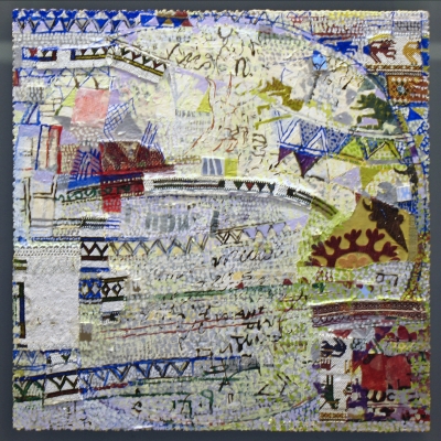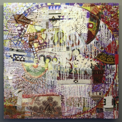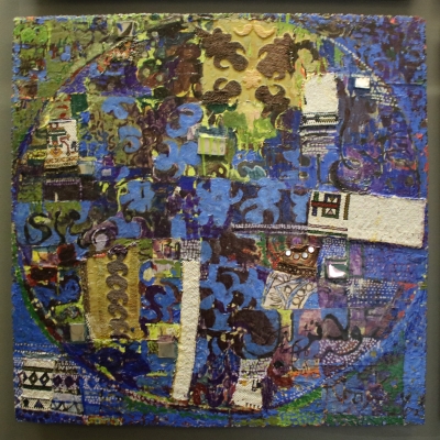 Keiko Hara uses painting, as well as fragments of fabric and text from cultures around the world, to create a collage artwork that evokes a sense of interconnectedness in the face of a period of global conflict. The title Topophilia - Imbuing in Maru refers to the love that each of us holds for places of personal significance ("topophilia") and the Japanese word for circle ("maru"), indicating something infinite.
