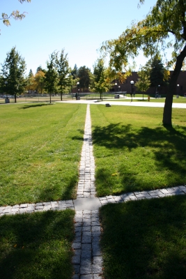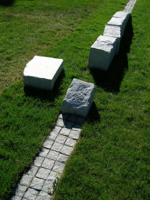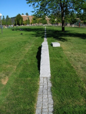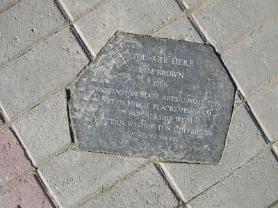 Artist Kim Brown's You Are Here draws quiet attention to two habitual student paths that cross each other, on the Eastern Washington University campus in Spokane. She has marked each path with granite cobblestones, prompting students to notice their daily rituals. At one side, the stones rise to different levels and serve as a place for students and staff to gather and sit. The artist notes that the paths are “reminders that intersecting moments comprise our lives, experienced by paying attention to here and now.”