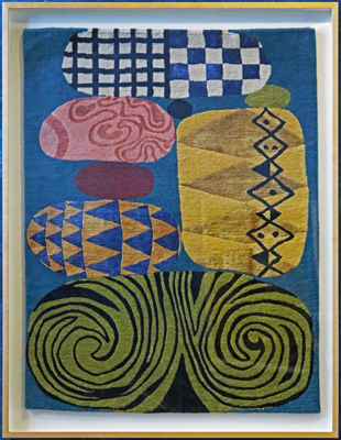 "Pila: The Polynesian Guy" is part of the "N=10" series of tapestry "portraits" by artist Lynn Basa. Each tapestry is created based on a questionnaire by Basa that was completed by a set of ten people. Basa designs the artwork using symbolic colors and forms to represent the answers. The questions included: Pick four colors; Do you prefer a window or aisle seat?; Pick three shapes; Would you rather be sailing, hiking, flying, or sunbathing?; and more. The resulting conceptual artwork is a portrait of that person.
