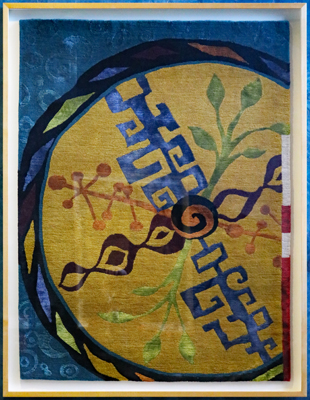 "Kathryn: Many Things to Many People" is part of the "N=10" series of tapestry "portraits" by artist Lynn Basa. Each tapestry is created based on a questionnaire by Basa that was completed by a set of ten people. Basa designs the artwork using symbolic colors and forms to represent the answers. The questions included: Pick four colors; Do you prefer a window or aisle seat?; Pick three shapes; Would you rather be sailing, hiking, flying, or sunbathing?; and more. The resulting conceptual artwork is a portrait of that person.