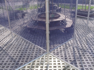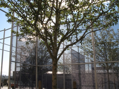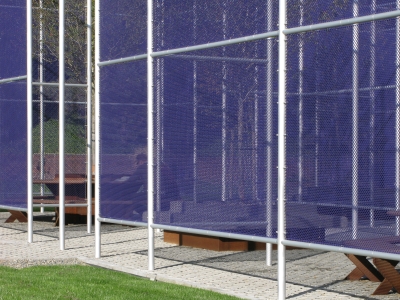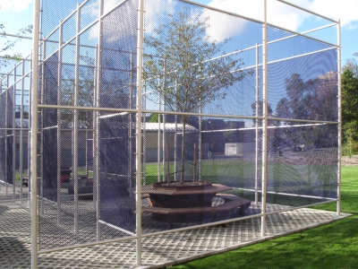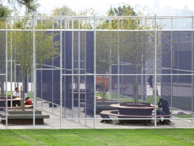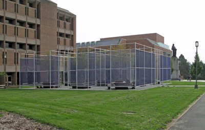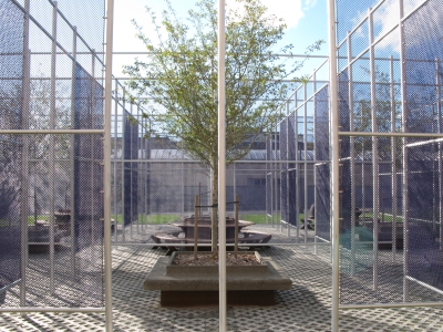 Robert Irwin's 9 Spaces 9 Trees was originally created for the rooftop plaza of the City of Seattle's Public Safety Building in 1983. After construction and plans for a re-design of the site required the artwork's permanent removal, it was re-conceived by the artist for the University of Washington campus in 2003. Irwin created the artwork's maze-like format to define nine gathering spaces. As light passes through the installation's fence walls, a sense of movement and rippled patterns are created. The nine gathering spaces can feel comforting and personal, or a little claustrophobic – they have layers of meaning. Depending on your angle to the fence walls, you see them as either see-through or semi-solid. The trees are lush and full of leaves in the spring and summer, and bare and open in the fall and winter. 9 Spaces 9 Trees creates spaces that are both private and public.