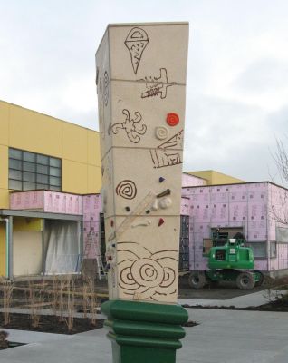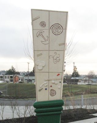 Artist Charles Bigger's Olduwan artwork uses the symbols and ideas of tools to represent the students studying trades at South Seattle College's Georgetown Campus. The sculpture was inspired by an archeological dig in Tanzania, East Africa. Bigger took part in the unearthing of tools and artifacts from the Pre-historic Period — a time before records documented human activity, roughly 2.5 million years ago to 1200 B.C. This connects pre-history with our contemporary culture and honors that archeological site. Bigger notes: "From this earliest time in pre-history we can follow the growth of mankind thru the use of his tools. Our understanding of who we are is found in those tools, objects, and art; made by the hand of man. Every craftsman, and every tool leaves a mark for history."