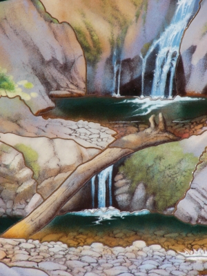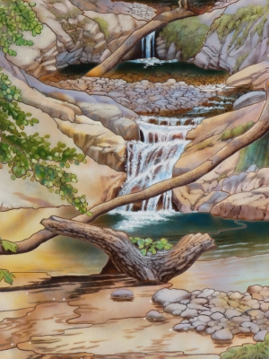"Serenity: Pride in our Formation" is one part of a two-part artwork by Ken Spiering that uses the river as a metaphor for our lives, with successive waterfalls and pools depicting placidity, turbulence, sunlight, shadow, stagnation, and flow, but always "recovering and collecting itself into yet another full volume."