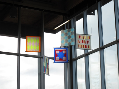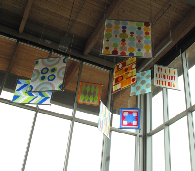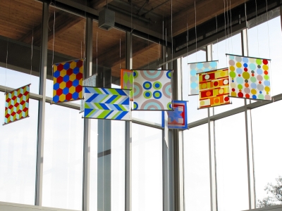 Suspended twelve feet off the floor in Tacoma's Gray Middle School, Rae Mahaffey's installation, "Intervals," fills the commons with bright color and reflected light. The fifteen fused glass panels explore pattern theory and color relationships, with imagery inspired by education and community.