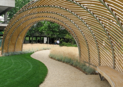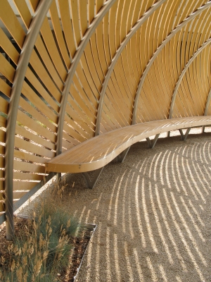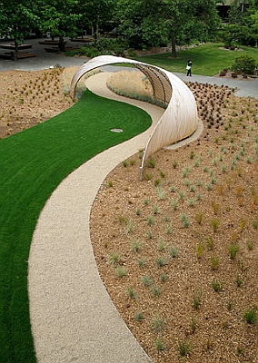 Lorna Jordan's site-specific installation ‘Reach’ defines both a pathway and a gathering space on the Edmonds Community College campus. The cedar and aluminum sculpture rises and twists to create an arched passageway. The sculpture includes a long bench within it that invites you to sit and be a part of the installation. The rippling plants around it that imitate its shape are also part of the artwork. Jordan notes that students and others on campus “are engaged as participants, not as spectators.”