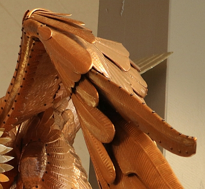 This sculpture is one of Buckner’s most time-consuming artworks. After making pencils sketches and studies, Buckner modeled a two-foot-wide eagle out of an oil-based clay. He made a mold and plaster cast of that eagle. He then used the model to build a steel armature on which to hang the metal. Using the intaglio method, he carved the negative form of different body parts such as the wings, head, and so on, into separate, full-sized wooden blocks (like a carved mold). Next, he laid a sheet of copper across the carvings and beat it down until the metal was flush up against every part of the wood. If his hammer work was too aggressive, splitting the copper, he started over.