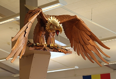 Eagle Spirit by Paul Buckner is a life-size sculpture that soars overhead and is "a real attention grabber." It portrays the majestic birds that Buckner first saw and heard while serving on a U.S. Coast Guard buoy tender boat in southeast Alaska.
