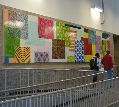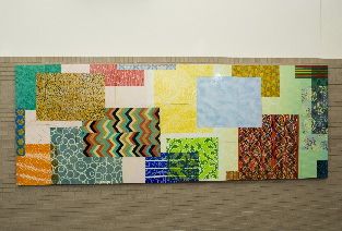 Rae Mahaffey's Erratics is filled with varied, textile-like patterns. The designs and the overall artwork create a sense of the diverse, global cultures found around Columbia Basin College, in Pasco, Southeastern Washington.