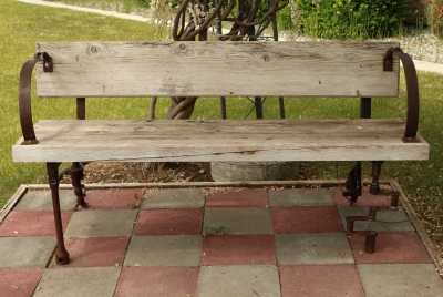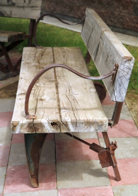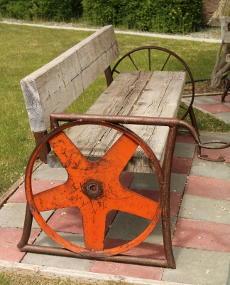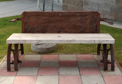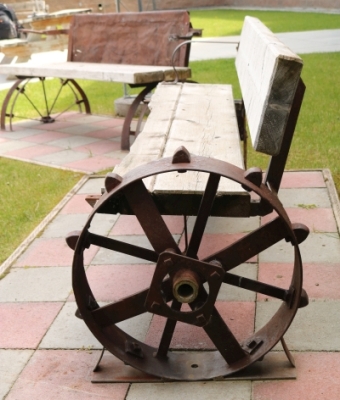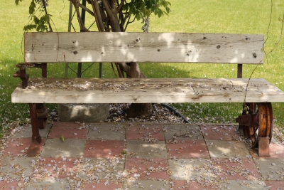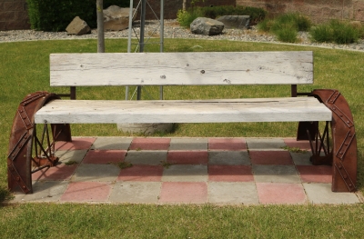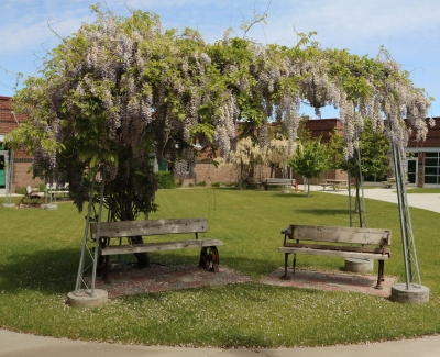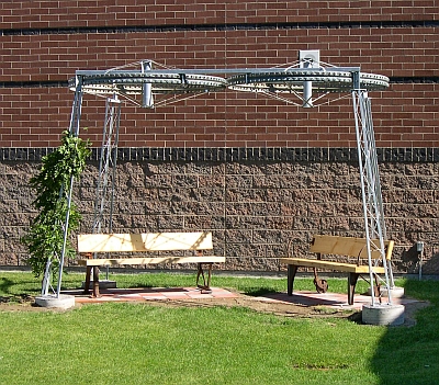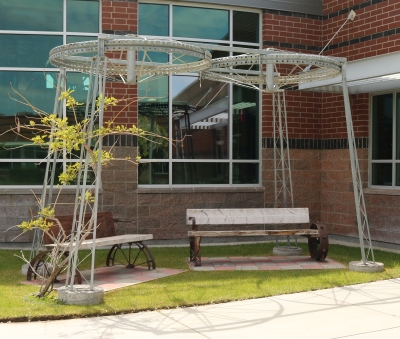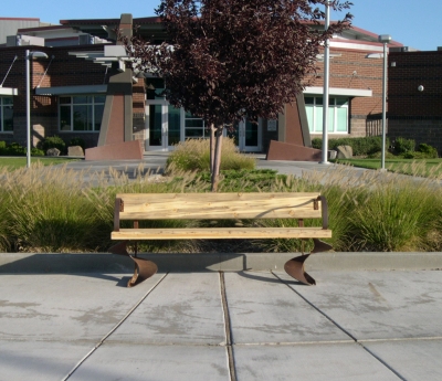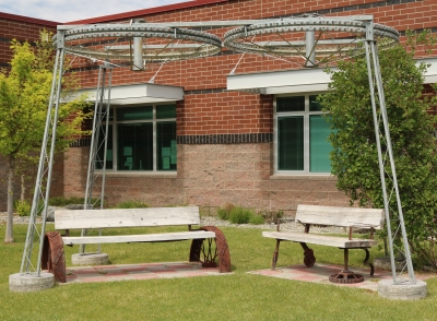 Brian Swanson's ‘Gallery of Tried Technology’ uses vintage farm equipment to create benches and shaded areas for Wahluke High School in Mattawa, a Central Washington farming community. The artwork title’s “tried technology” refers to the vintage farm equipment, donated locally by Eckenberg Farms. The installation is in an outdoor courtyard, outside of the school’s cafeteria. Swanson built benches with parts of salvaged wood and old machine parts including: wagon wheels, sledge hammers, a crankshaft, brackets, grain grinders, plough teeth, and more. He built the surrounding trellis structures with recycled field sprinkler wheels. Plantings around each trellis are also part of the artwork. Swanson planted climbing wisteria and vines to provide shade from the strong Central Washington sun. The local art selection committee wanted an artwork to represent and promote unity between groups. Swanson spent time in Mattawa in order to understand the community and create a piece of art that would speak to them.