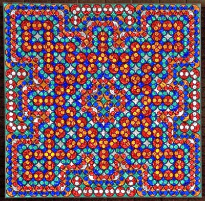 Artist Dick Elliott used industrial highway reflectors to make 'Crossroads.' The three panels create a kinetic light landscape in the main entryway of the school which is a center of student traffic. Day or night, viewers will experience the ever-changing nature of light. Elliott notes: "The similarities of patterns across cultures has led me to believe that geometric patterns are an intuitive universal language."
