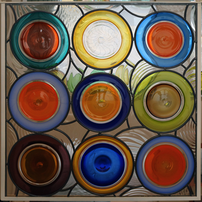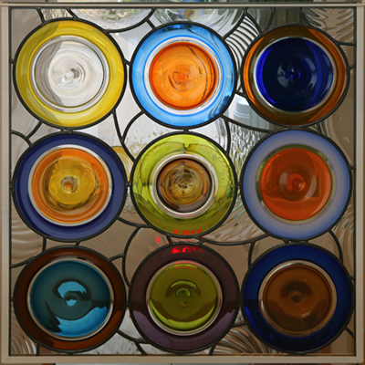 Sonja Blomdahl created Join Together for Chester Thompson Elementary. The four-part glass installation features overlapping, hand-blown disks. Called "rondelles," she describes these colorful glass pieces as "bowls spun out flat." She used multiple colors of glass bubbles to create rings of different colors. She notes, "I titled this piece Join Together because I want the glass panels and colors to join together, blend and change. I hope this happens at the school too, where students, staff and community can join together and see things from different points of view."