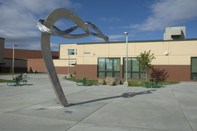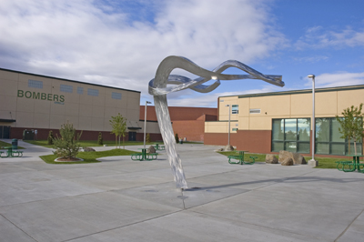 Artist Micajah Bienvenu's kinetic sculpture Flexibility is inspired by the wind. The top of the artwork is like a cloud formation or a wind pattern, and the entire sculpture turns in the wind. Bienvenu was inspired by time spent in Eastern Washington experiencing the wind. He notes, "From powering the tumbleweeds of my youth to the spinning windmills and wineries of today, the wind blows steady and those that are flexible are our future." The metal surface textures also imitate gusts of wind on a blustery day. The textures are created using zirconium (artificial diamond) sandpaper. The surfaces almost look like holograms and reflect the world around them.