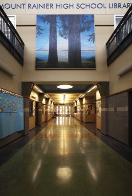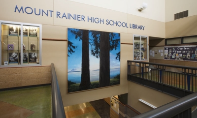 Forest, Mountain, Sound is a large painting by Michael Brophy showing the environment surrounding Mt. Rainier High School in Des Moines on Puget Sound. The 11 x 11 foot artwork is installed so that it can be seen from the school's main or second floors. Brophy notes, "The school and Des Moines itself have a maritime orientation, facing the Sound... It is a view with the potential of the future for the students of Mt. Rainier High School."