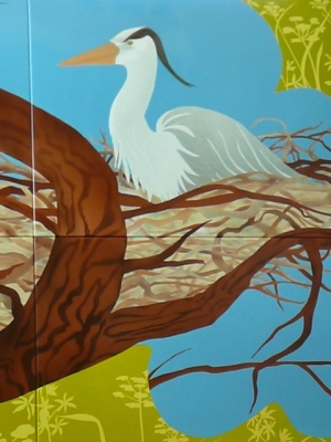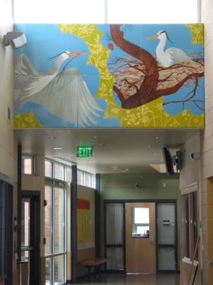 The Rookery's six porcelain enameled panels depict two herons in their nest. Its imagery is inspired by the nearby Turnbull Wildlife Refuge, which provides habitat for a colony of Great Blue Heron.